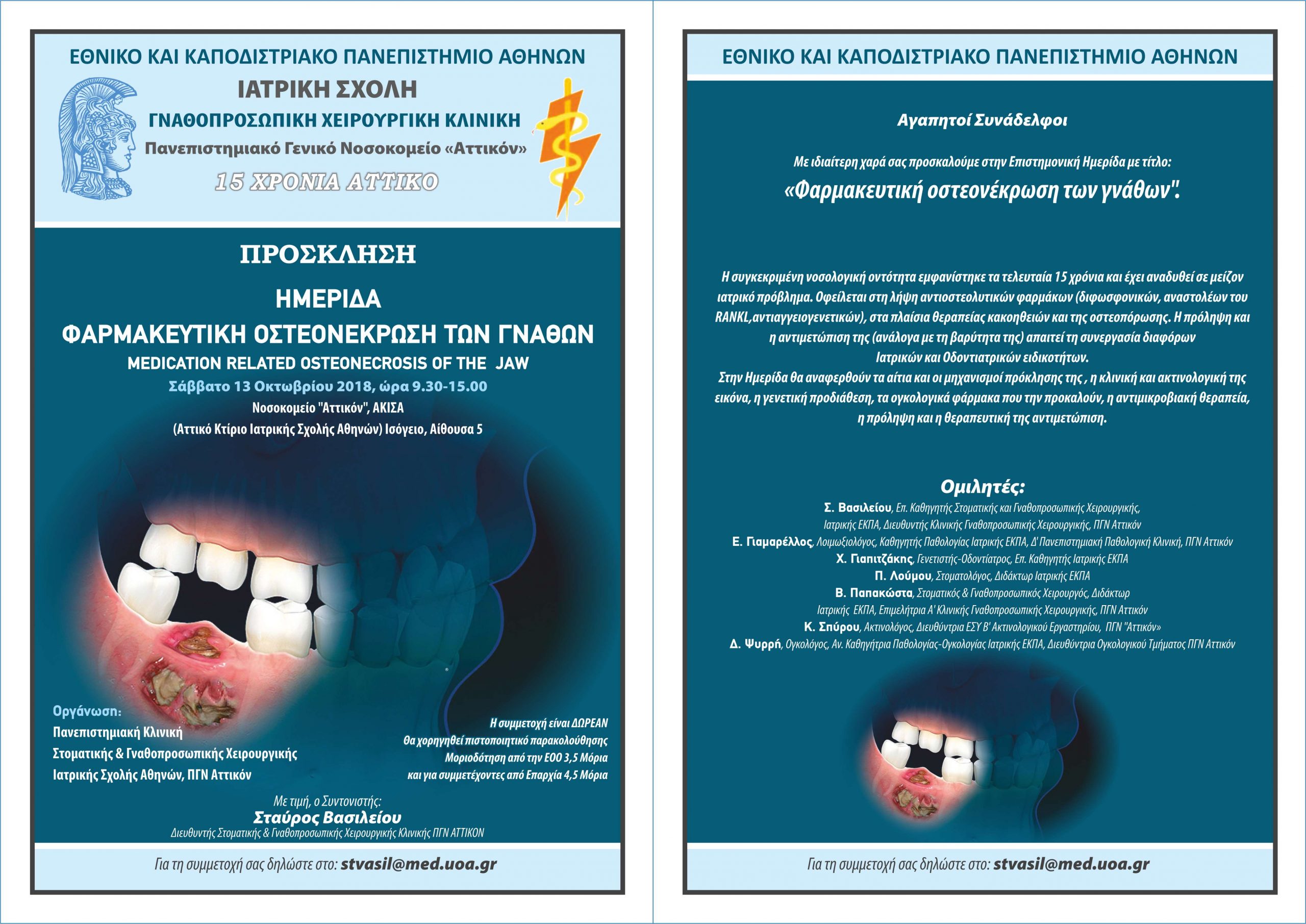 Ημερίδα Κλινικής Στοματικής και ΓναθοπροσωπικήςΧειρουργικής Νοσ. «Αττικόν» με τίτλο “Φαρμακευτική οστεονέκρωση των γνάθων”, 13-10-2018, Νοσοκομείο «Αττικόν»